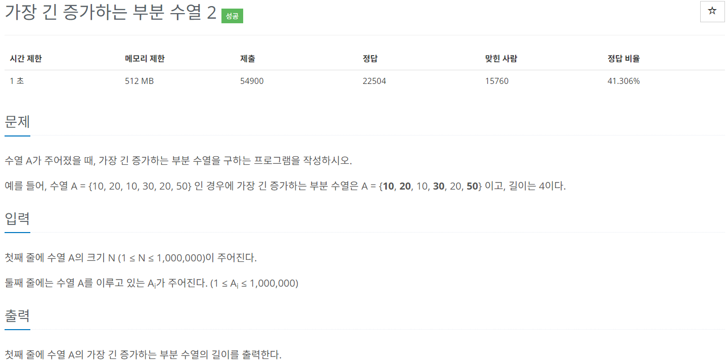 - 부분 수열의 길이만 구하면 되므로, 배열을 두개 생성 ( LIS 임시배열, 입력 값을 받는 LIST 배열 )