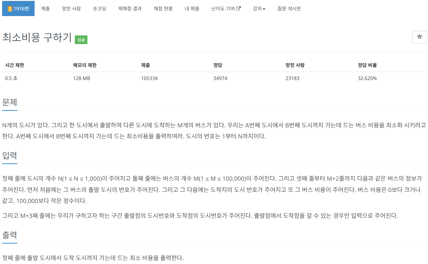 > 출발 노드와 도착 노드가 정해지지 않았다.> 도시의 개수 1000, 버스의 개수 100,000 이므로 시간유의