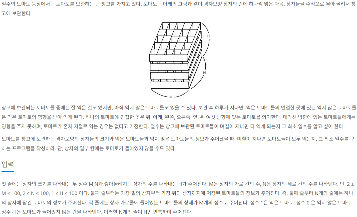 - 가로, 세로, 높이가 존재 => 전역변수로 long long 형 3차원배열 두개 선언(방문 확인, 토마토 박스)