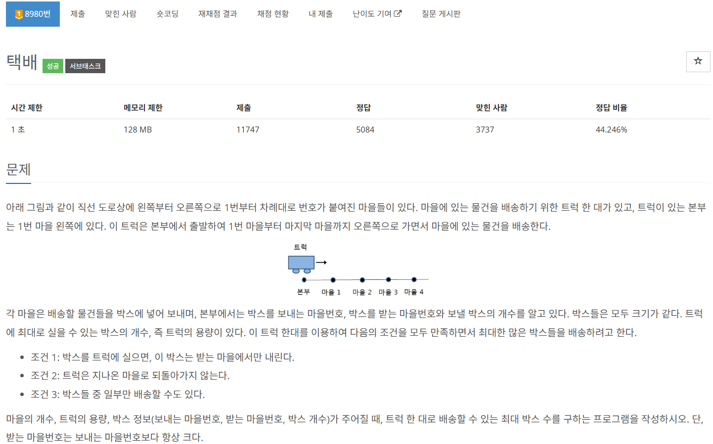 2. 반복문에서, 택배의 최대 용량에 맞춰서 weight 배열에 마을 시점의 용량 기록